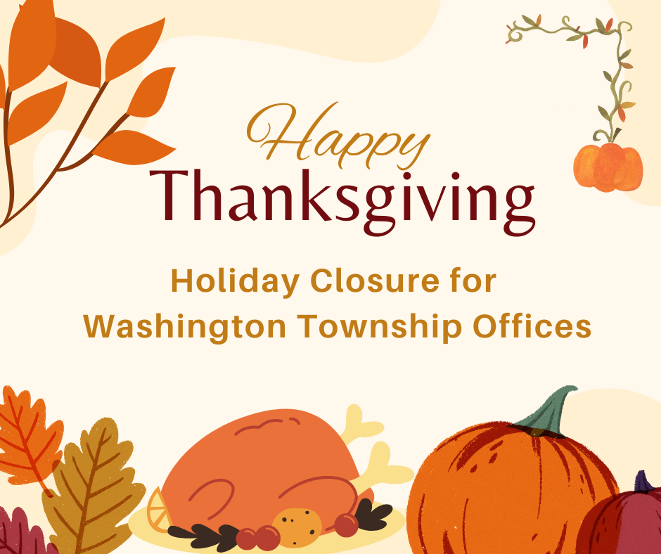Washington Township Municipal Offices will close at 2:00 pm on Wednesday, November 25, 2025, and will be closed on Thursday, November 27th and Friday, November 28th. We will reopen at 8:00 am on Monday, December 1, 2025.