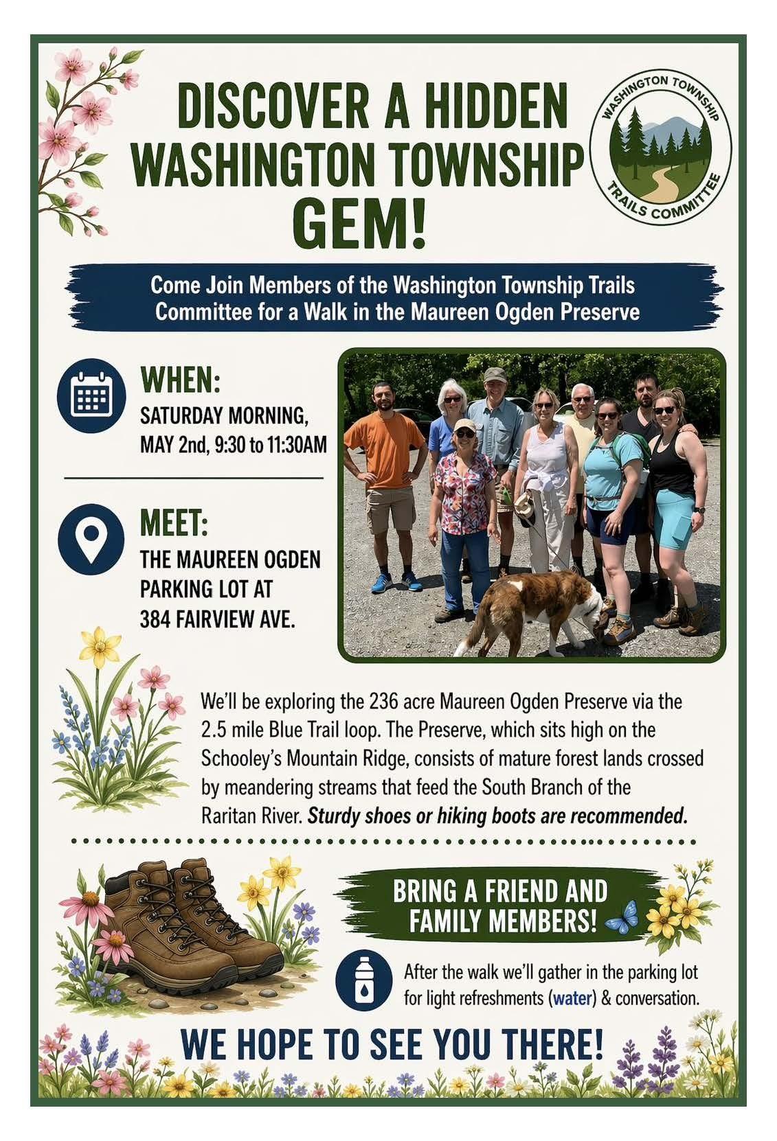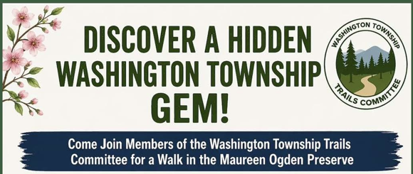 Come join members of the Washington Township Trails Committee for a walk in the Maureen Ogden Preserve on Saturday, May 2nd from 9:30am-11:30am.