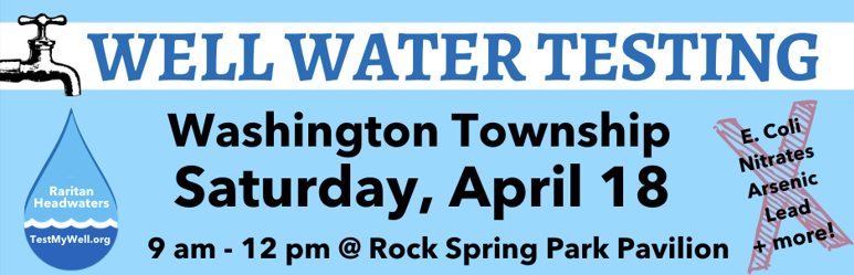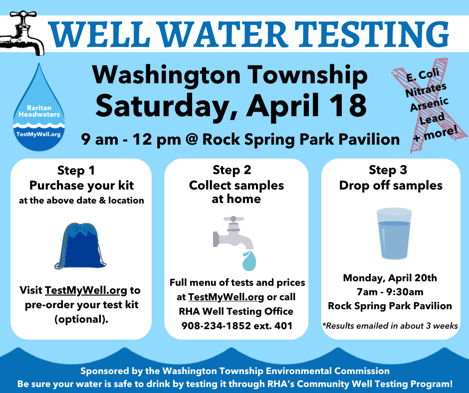 The Washington Township Environmental Commission is sponsoring a Well Water Testing Event on Saturday, April 18 from 9:00am-12:00pm at the Rock Spring Park Pavilion located at 35 E Springtown Road, Long Valley.