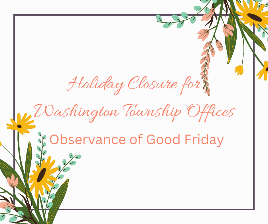 Washington Township Municipal Offices will be closed on Friday, April 3, 2026 in observance of Good Friday. We will reopen on Monday, April 6th at 8:00 am.